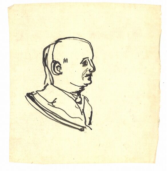 今回あわせて展示される素描(本展cat.no.3)は、2012年に岩手県立美術館をはじめ全国5館を巡回した生誕100年の回顧展にも出品されており(生誕100年展D051)、その際には合わせてもう1点の素描(生誕100年展D050、参考図版1)も展示されていた。D050の素描は、1942年2月1日~3日に日動画廊で開催された「松本俊介第二回個人展」の案内状に図版掲載されている(生誕100年展M07-05)ということを、大川美術館長の田中淳氏からご教示いただいた。今回展示される油彩の《コップを持つ子ども》も、この「第二回個人展」に出品された可能性があると想像され、調べてみることにした。幸い東京国立近代美術館には、松本竣介の親友であった難波田龍起からご寄贈いただいた同展目録があり、それを繰ると、D050およびD051とは異なる同構図の素描(参考図版2)が掲載されていることが判明した。目録では「三十三 素描 五号」とある。目録には全部で35点の記載があり、題名と大きさから類推して「五 小供 五号」と記された作品が、このたびの油彩の《コップを持つ子ども》である可能性が高いように思われる(註1)。