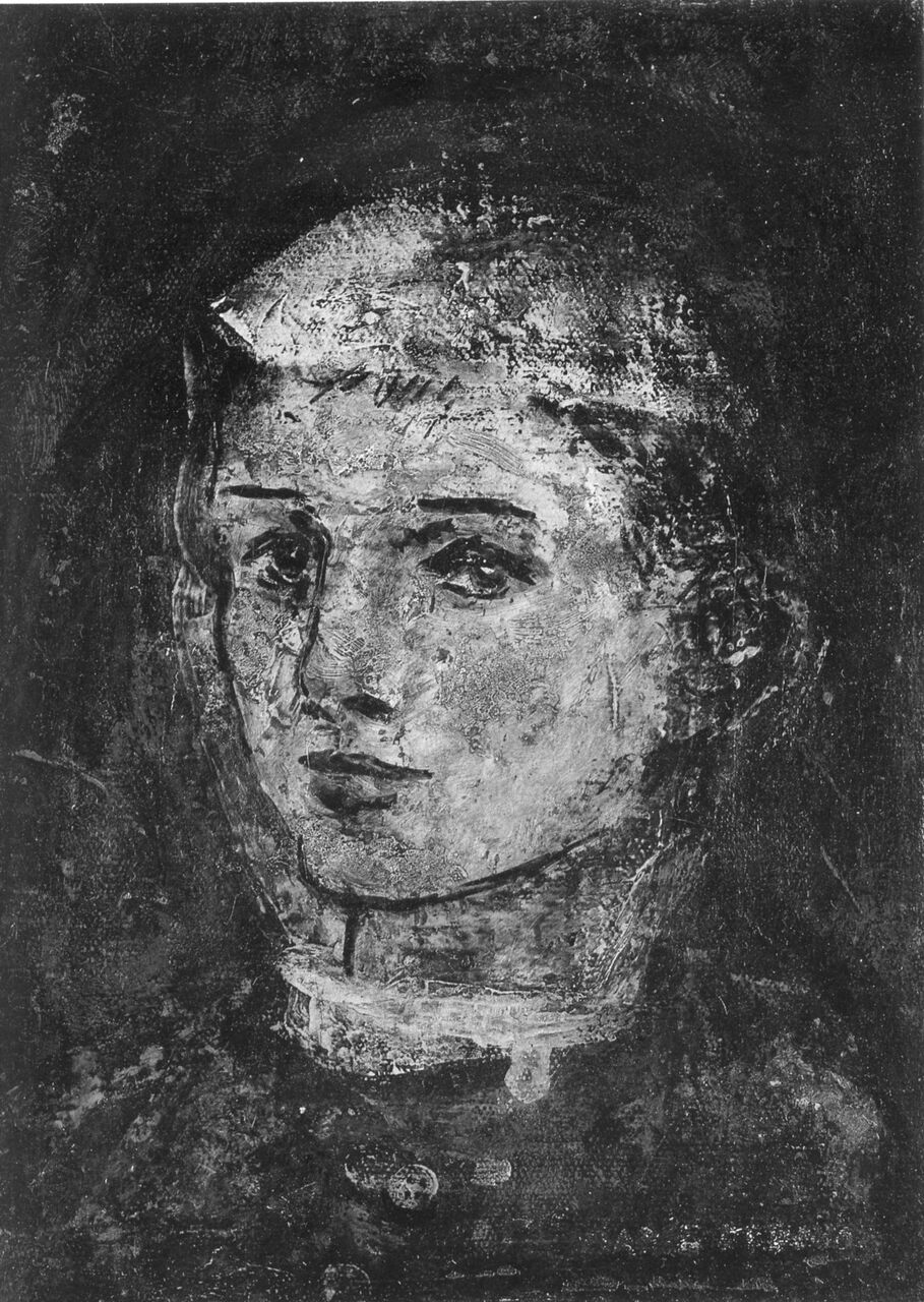 この記述によれば塗りと線描が何度も交互に重ねられていることがわかる。とはいえ、このメモは1939年から40年にかけて使われた手帖に記されたものだから、作風としてはモンタージュ的な都会風景を描いていた時期にあたる。この時期の作品は、小林俊介氏が指摘するように「線とマチエールの葛藤とズレ」を本質としていた(註6)。しかし1940年代に入ると、線とマチエールの関係には変化が生じる。1942年1月に描かれた《コップを持つ子ども》は、時期的には上述のメモに記された、塗りと線描を交互に進めていく描き方と、舟越の回想に見られる、塗りと削りの繰り返しによって地の部分の諧調を深めた上での線描という描き方との間に位置づけられるのだろう。色面と輪郭線との関係を注意深くたどっていけば、やはり何度か交互に描き進められていることがわかる。そして背景。深い闇に用いられている色彩も、服やコップに用いられているのと同じ朱色が下層に認められる一方で、その補色となる青緑色も重ねられていることがわかる。それによって闇の深みが増すわけだ。背景を何層にも深く塗りこめる一方で、前述の丸みのある額に見られるような明部を際立たせていくことで、子どもは闇の中に浮かぶ灯のような存在感を獲得するのである。