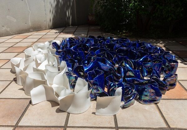 本展は刊行を記念して、新作のドローイングやコラージュ、陶作品のインスタレーション《pearl blueの襞̶空へ・ソラから》など展示します。