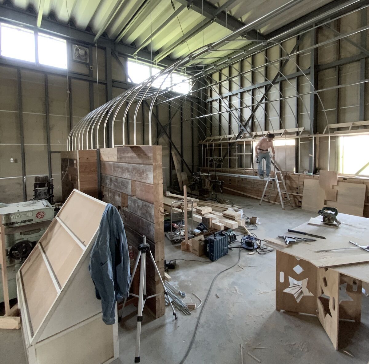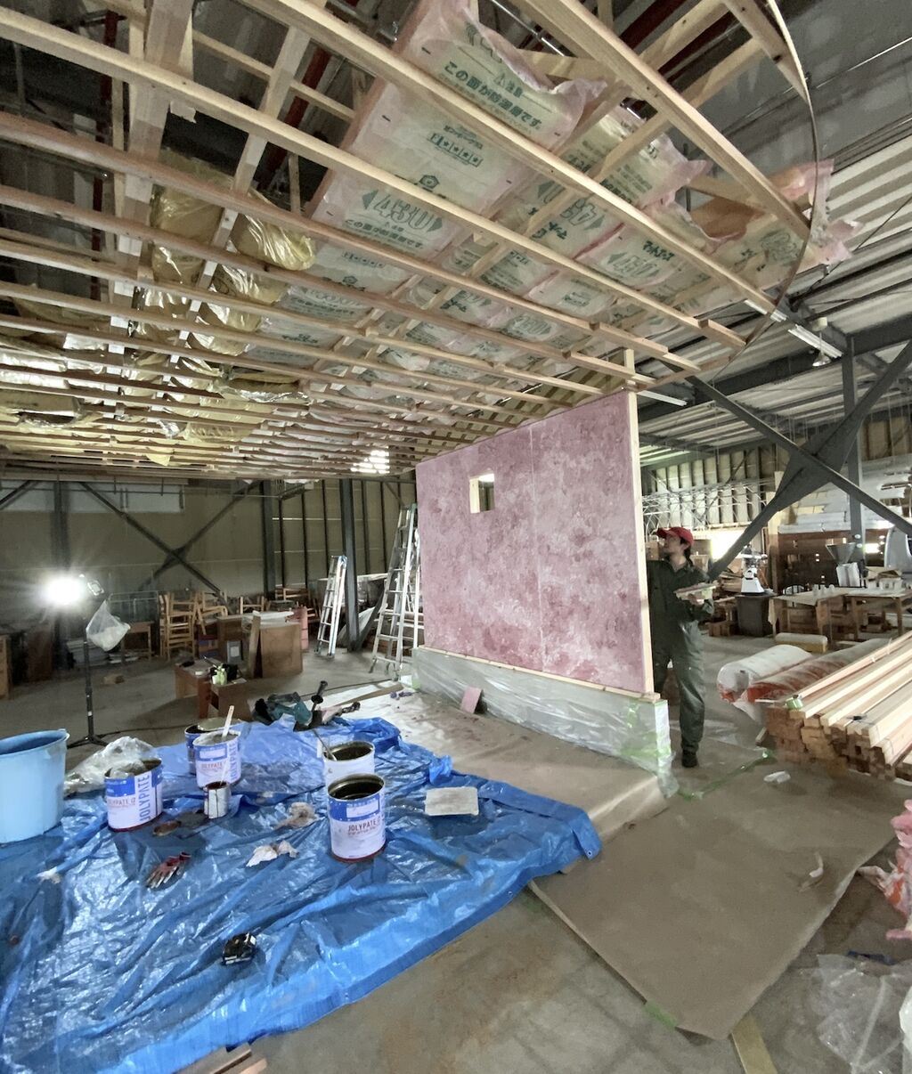 木工所の壁とアーチ天井の工事。ログ材を基礎として立ち並ぶハウスのアーチパイプに米の籾殻を詰めた断熱パックが敷き並べられる。