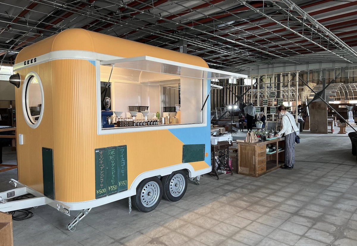 キッチンカーでのコーヒーと物販販売の様子。現在は不定期で営業中。このキッチンカーは運営者の方が用意したものだが、このキッチンカーの配色をきっかけとして、建屋全体の配色計画に本格的に取り組む形となった。