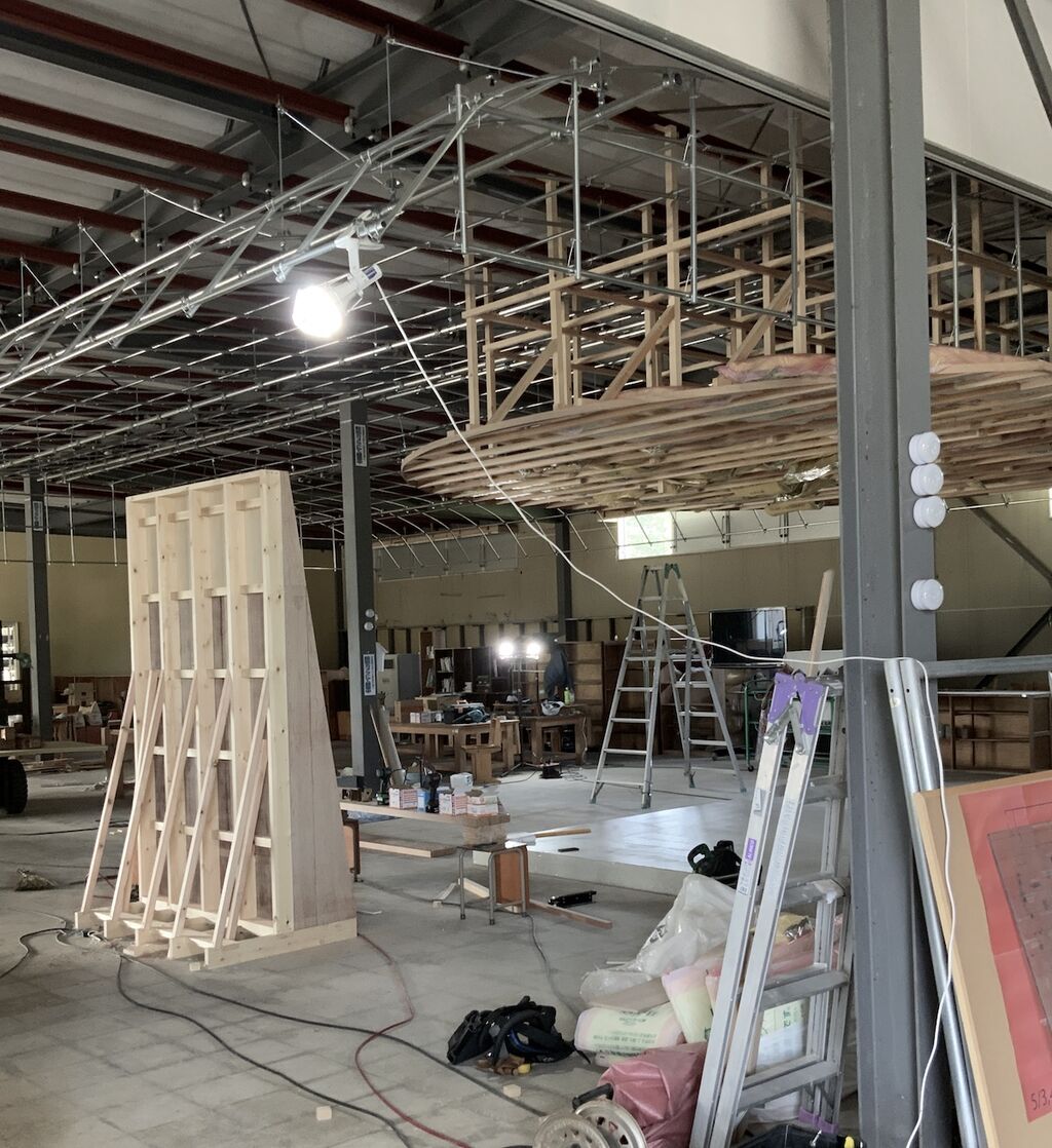 内部の什器の制作、メンテナンスを含めた工事を続けている今の現場には、近所で廃校になった小学校から譲り受けた机や椅子、理科の実験器具などさまざまな備品が詰め込まれている。そして本宮市の応急仮設住宅で使われたログ材の資材なんかも山盛りで現場に持ち込まれ、まだそれもかなりの量がある。1,000㎡ほどのとても大きな建屋に、大量のモノ。