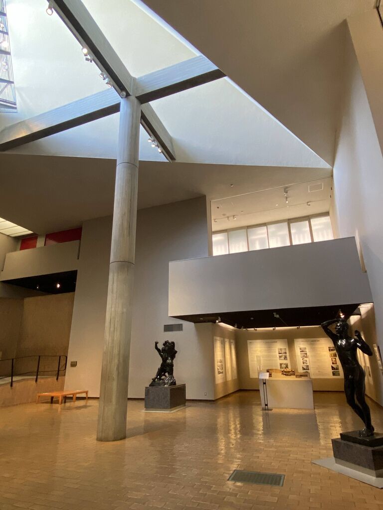 建物内部では大きく変わった部分はありませんが、リニューアルオープンにあたり、これまで有料だった本館中央の吹き抜け空間「19世紀ホール」を当面の間無料開放しております(2階展示室へと続くスロープより先はこれまで通り要観覧券)。ル・コルビュジエ自身が「19世紀大ホール」と呼んだこのホールは、当館常設展のはじまりの場所であり、ここを起点に展示室を螺旋状に増築することができるという「無限成長美術館」のアイディアを反映しています。三角形の天窓からやわらなか自然光が注がれるホール内では、ロダンの彫刻群や建築に関するコーナー展示も見ることができます。