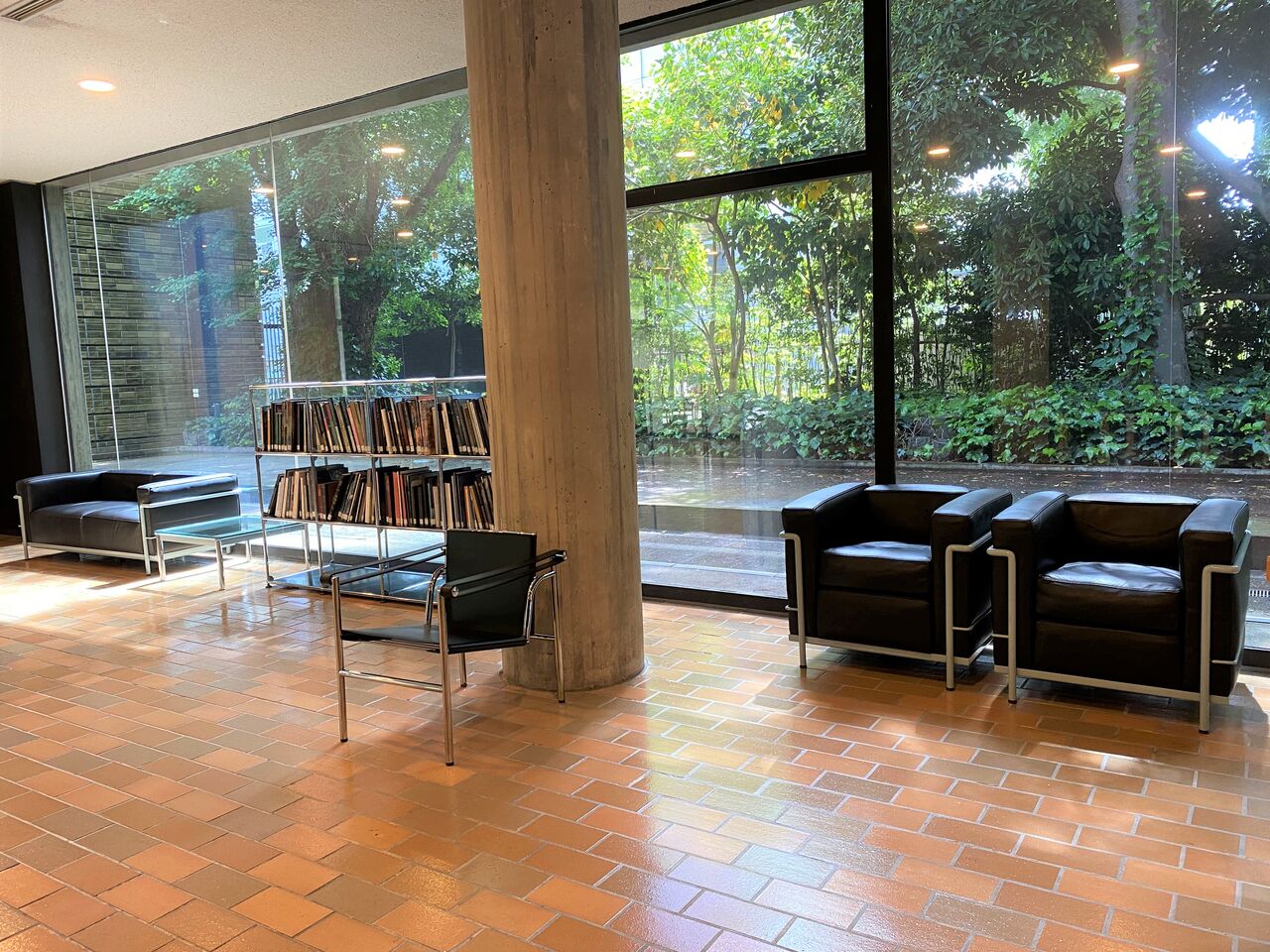 「調和にむかって:ル・コルビュジエ芸術の第二次マシン・エイジ」展を見終わったら、最後に常設展示室出口付近にある休憩スぺースにもご注目ください。当館の過去の展覧会カタログなどを自由に閲覧できるこのスペースにさりげなく置かれているのは、ル・コルビュジエがシャルロット・ペリアン、ピエール・ジャンヌレとともに1920年代後半にデザインし、現在でも「LCシリーズ」としてカッシーナ社から復刻生産されている家具の名作たちです。「グラン・コンフォール」と呼ばれるソファは、リニューアル前から10年以上使用されていましたが、革の張替えとメンテナンスによって新品のように蘇りました。また、背もたれが自在に動く肘掛け椅子、通称「バスキュラン」がこの度新たに加わり、ル・コルビュジエと2人の協働者によるモダン・デザインを体験できる小空間となっています。