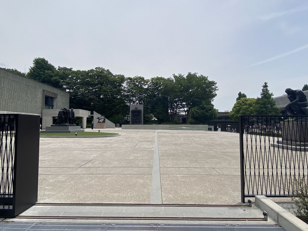 過去の改修で失われていた西側の出入口を再び設けたことで、ル・コルビュジエが想定していた西門から本館へのアプローチが復活し、それに合わせてロダンの彫刻《考える人》と《カレーの市民》を創建時の位置に戻したことも大きなポイントです。前庭の床面には、西門を起点に一直線に伸びる線と、途中で左に分岐して本館入口へと伸びる線が引かれています。この線をたどって歩みを進めると、ロダンの彫刻とともにうつりゆく光景を楽しみながら、矢印などのサインがなくても自然と建物へと誘われる、そうしたル・コルビュジエの空間デザインを再び実感できるようになりました。