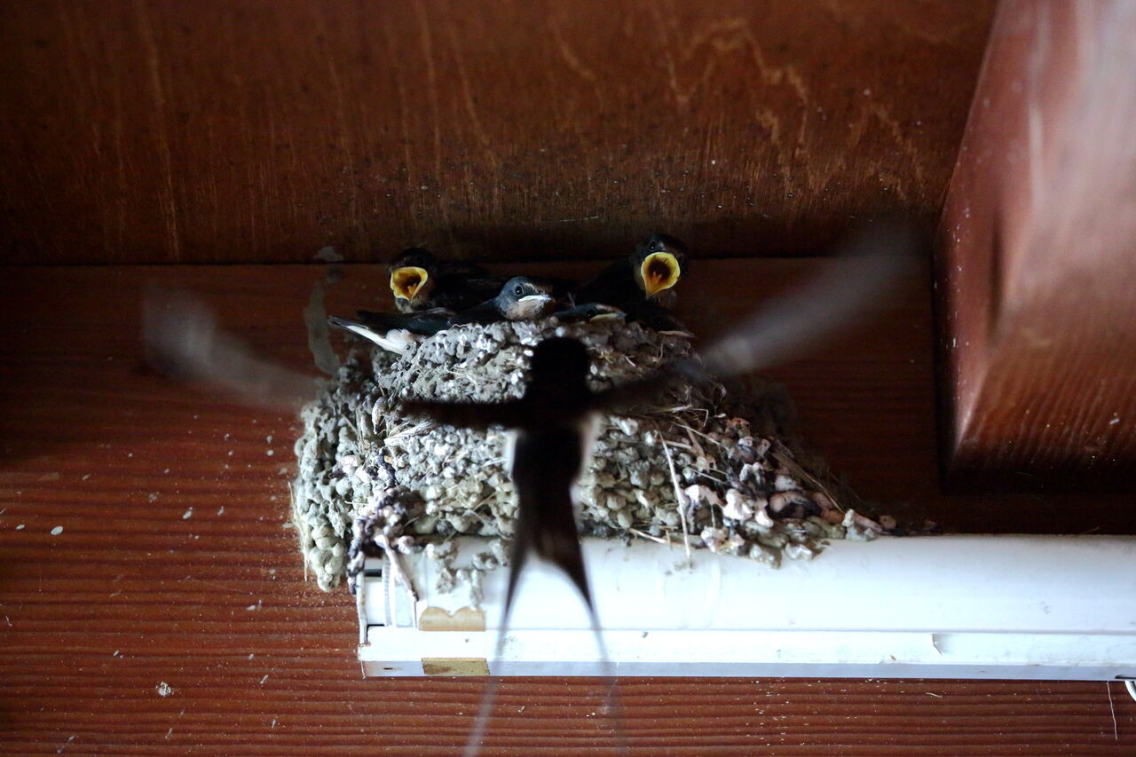 しばらく前から、ツバメが畑の納屋で子育てに大忙しです。何年ぶりになるのでしょうか。今年は留守の間も窓を開けておいたのです。すると、なんとうれしいことでしょうか、ツバメはこれまであった古い巣を再利用して、子育てを始めたのです。