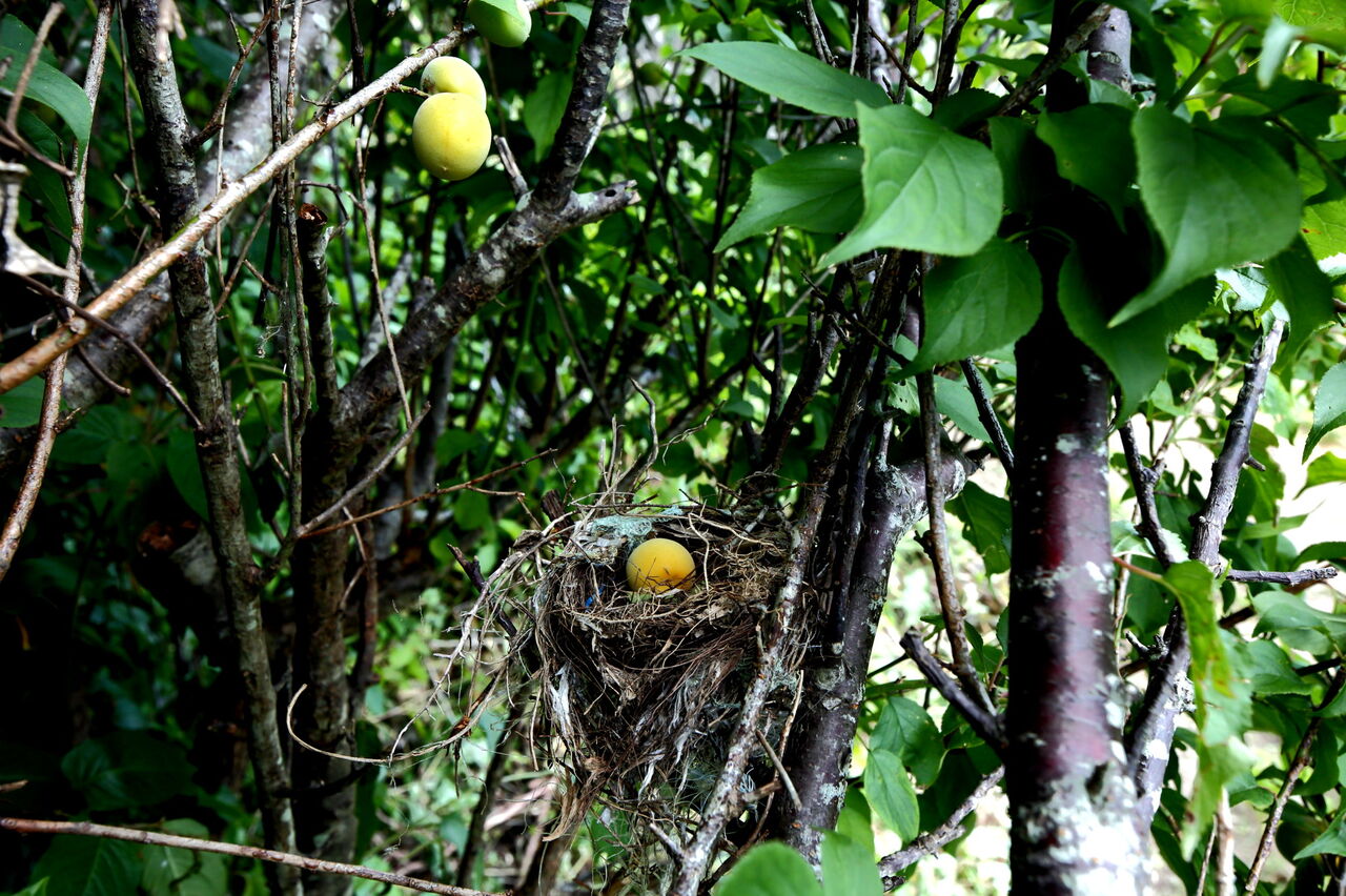 私がその写真を撮っていると、妻がウメの木に小鳥の巣があるのを見つけました。たまたまということですが、巣のなかにウメの実が落ちていたので気づいたのです。どんな種類の鳥なのか分かりませんが、こちらの子育てはすでに終わっているようでした。>