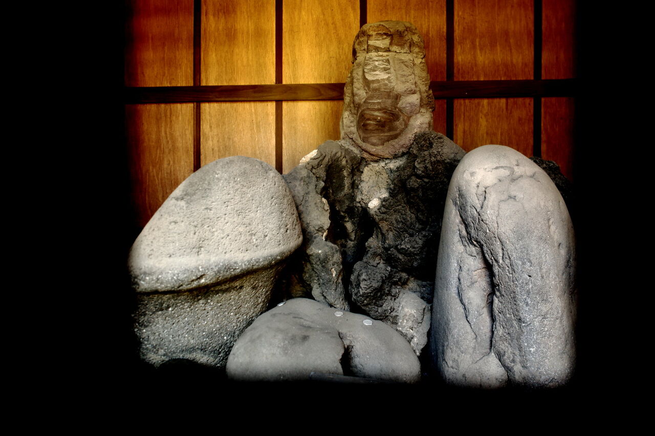 ph13 南泉寺。小祠に祀られた陰陽の石像。額に「おまねぎ」「客人祭」。荒川区西日暮里3-8-3。2012.11.18