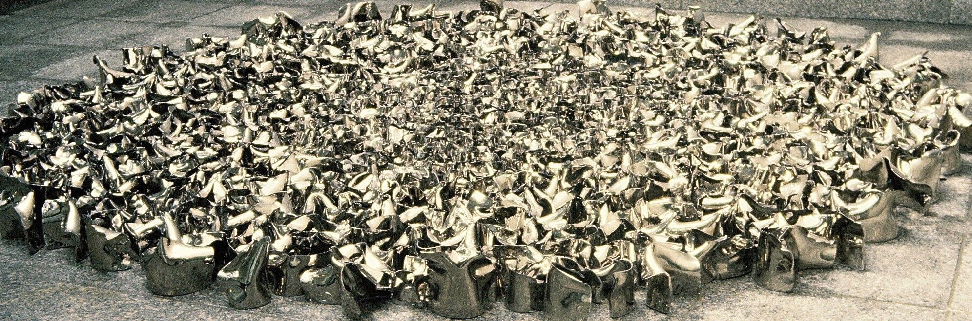 図版2) 愛知県美術館に出品した作品です。複雑な鏡曲面の集合体は、太陽光を乱反射させます。その結果、太陽熱を拡散させるという実験的な要素を思考したものです。光化学、熱化学の専門家とコラボできればと思いますが….!