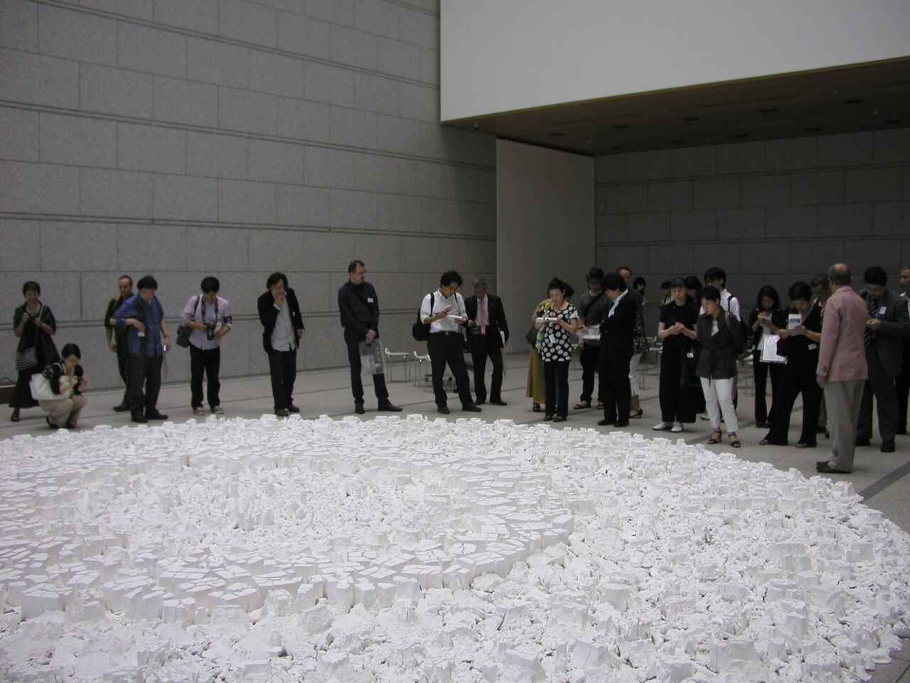 図版3) 東京都現代美術館での個展「秩序とカオス」のプレス発表会・メイン作品「アルミナのエロス・白い固形は…..」日本の展覧会では、美術館では初めての個展「土の地平・伊藤公象展」(富山県立近代美術館)や富山県黒部市の入善町森の発電所美術館が独特な展示スペースである(作品集に収録)。特に印象深いのは、2009年の茨城県陶芸美術館と東京都現代美術館を巡回した「伊藤公象 WORKS 1974-2009展」がある。陶芸美術館はガラスケースが多い。貴重な陶芸作品や工芸作品を展示する必要からだが、陶造形といってもインスタレーションの展示には難がある。それでも企画担当の学芸員が苦心の末に作家の要望を汲んで普段使わないような場を設営してくれた。東京都現代美術館は現代美術が専門だから、作品展示が楽だろうと思うが、そうではない。御影石で床や高層な壁面を天井高まで張り巡らしたアトリウム、その先の大ガラス越しに見える屋外の広大なサンクンガーデン、そして展示室がアトリウムを取り巻く。担当した学芸員とアトリユムの床に座り込んで打合せた記憶が生々しい。