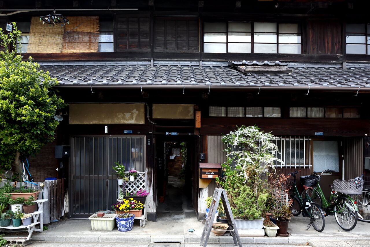 ph8 瓦葺木造二階建ての長屋と思しき住居。通路の奥に別棟がある。上野桜木2-11。2022.03.30