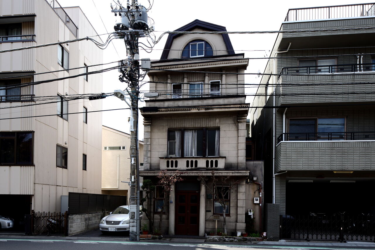 ph8 瓦葺木造二階建ての長屋と思しき住居。通路の奥に別棟がある。上野桜木2-11。2022.03.30同じ「東京詠物集」に「増上寺山門」と題した二首がある。