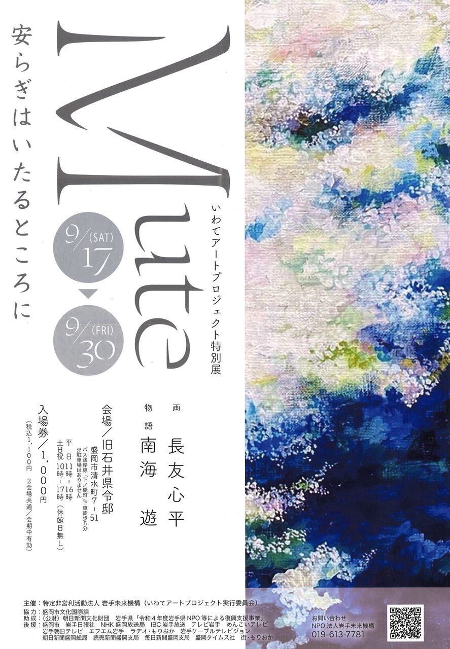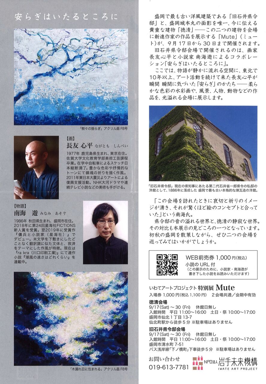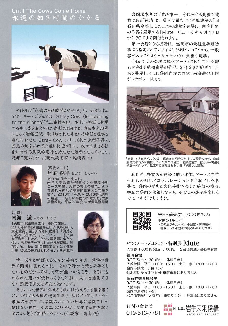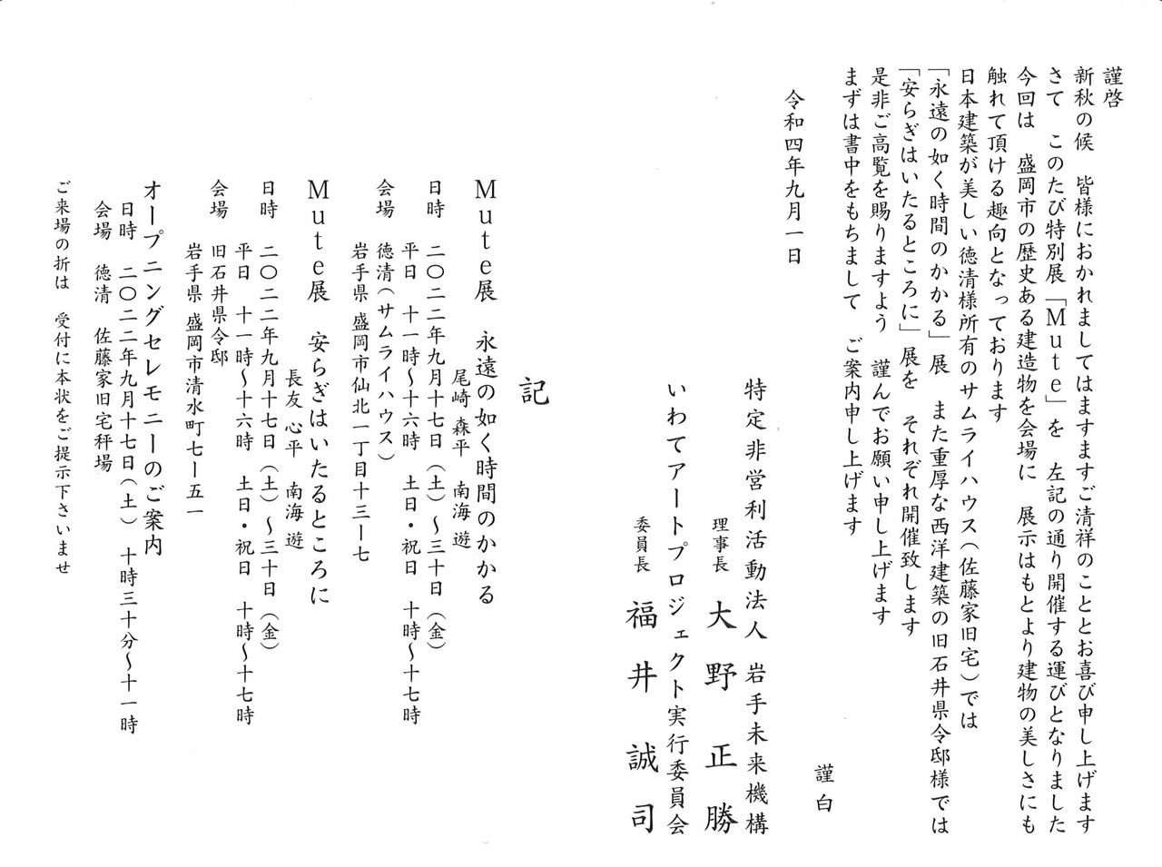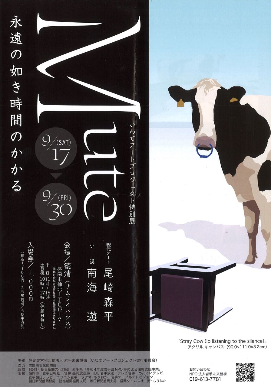 岩手未来機構が主宰する展覧会「Mute展 永遠の如き時間のかかる」が盛岡市で開催されます。ときの忘れものから尾崎森平さんの作品3点を貸出していますので、お近くの方はぜひご覧になってください。会場は、「徳清」と「旧石井県令邸」の2カ所あるそうですが、尾崎さんの展示は「徳清」で開催されます。