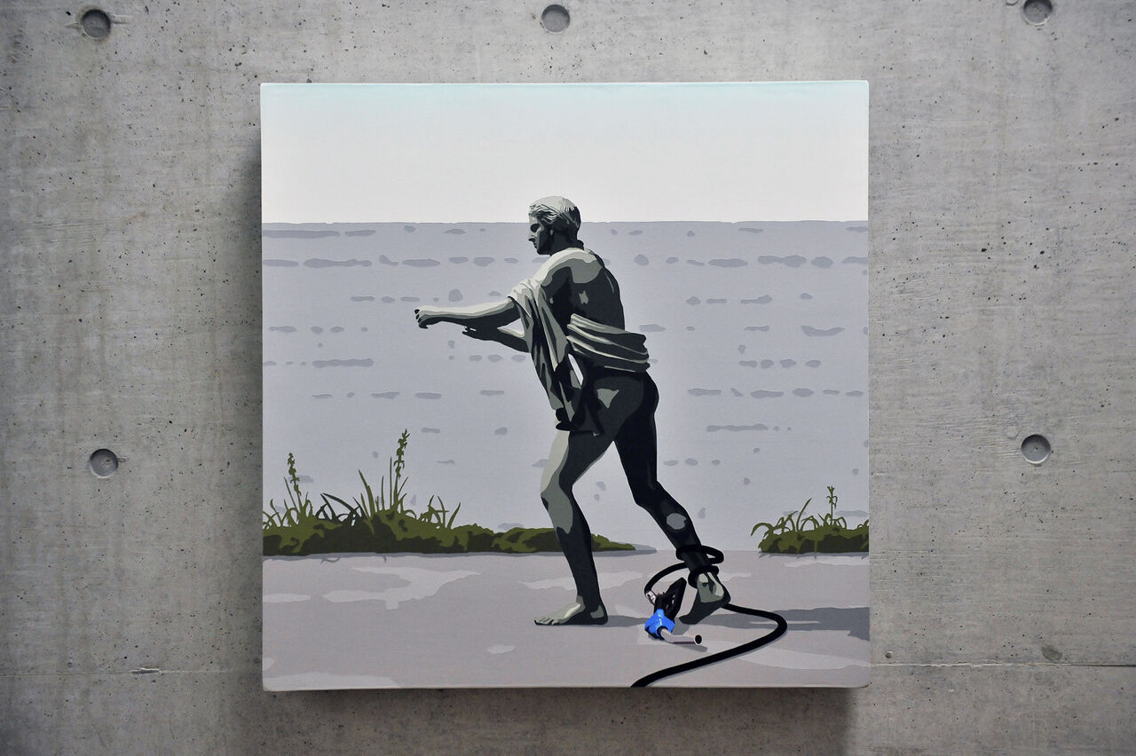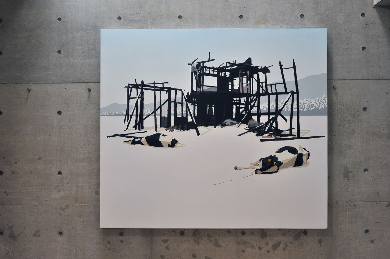 ギリシャ神話に登場する牛に姿を変えられた悲劇の娘イオと、東日本大地震によって避難区域に取り残された牛という神話と現実を重ね合わせた 尾崎氏のStray Cowシリーズ初の大型作品で、安息の地を求めて永遠に彷徨う牛に、我々の生きる社会に対する象徴的意味を持たせた展示となっています。