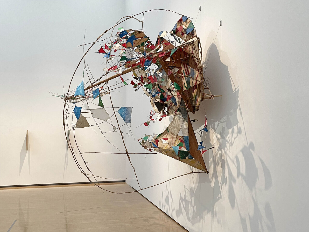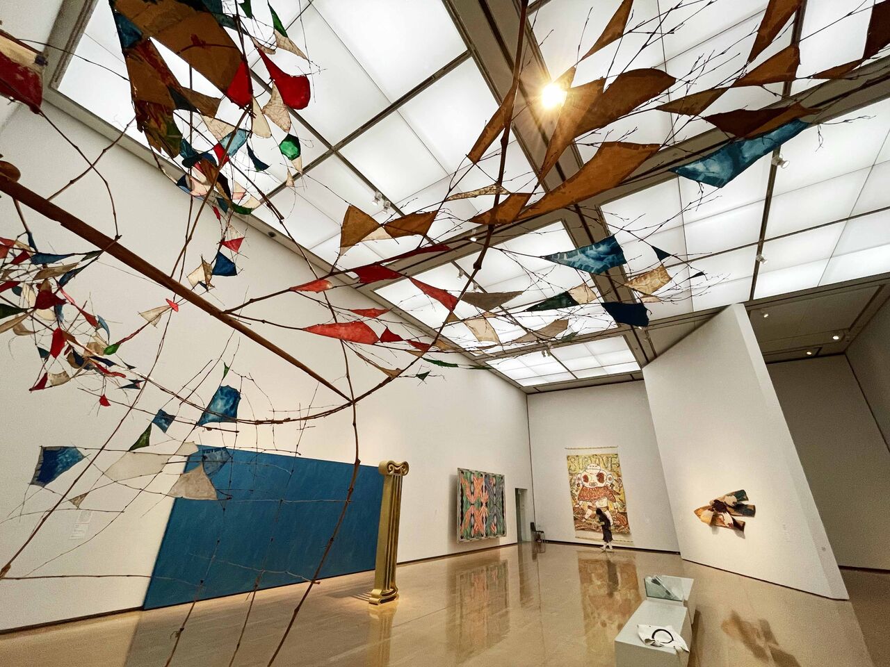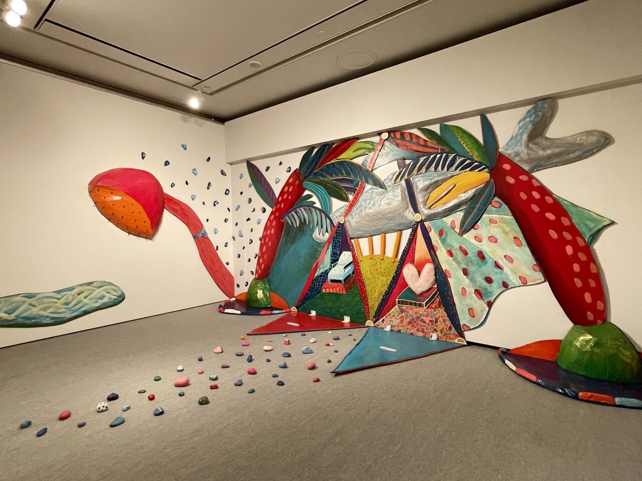 3階企画展示室への大階段。壁面に藤浩志『こいのぼりくんの一生』(1983/2022年) 作家蔵