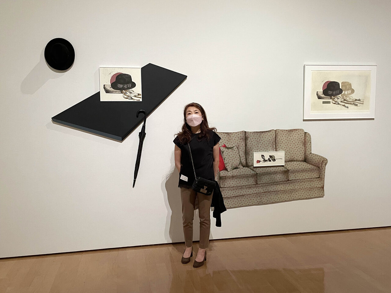 また、番画廊での発表を見逃していた吉原英里の『M氏の部屋』(1986年)と出会えたのは爽やかな幸せとなった。帽子や傘やマフラーのリアリティ、机や椅子の再現感。版画でみせたラミネート技法が現実の空間を覆っている。インスタレーションと言えるが、空間への押し付けが無いのですな、「不在」を描いた故だろうか。会場で居合わせた彼女に思わずパチリをお願いした。