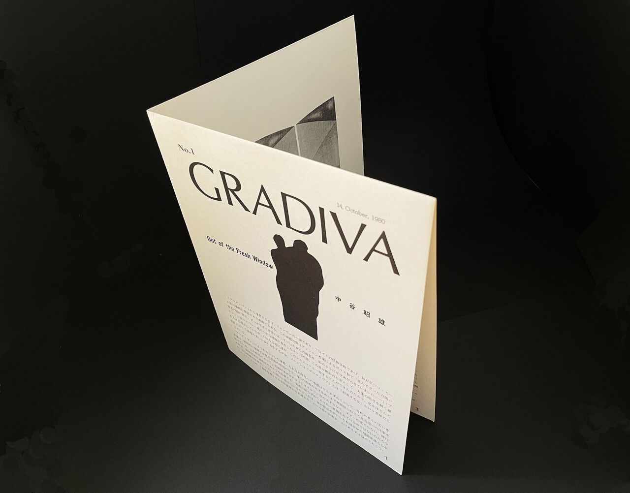 気楽な観客である訳だが、シュルレアリスムに共感する者として「街路の思想」を具体化する表現を考えた。美術家としてではなく、出版人としてである(大げさ)。それで、冊子を準備した。幸い勤務先の関係で編集、写植、写真、レタッチ、印刷に精通する友人・知人に恵まれていたので、酒宴の力を借りて同意を取り付け、大判四つ折りアンカットのシートを作成した。狙いは同時代の作家紹介、批評家と作家のコラボ。ギャラリー16の井上道子の推薦で美術家を中谷昭雄、批評家を中島徳博としての創刊号となった。冊子の名前は『グラディヴァ』──ブルトンが30年代に短期間運営した画廊の名前を拝借し、シンボルにマルセル・デュシャンの扉デザインを用いた。