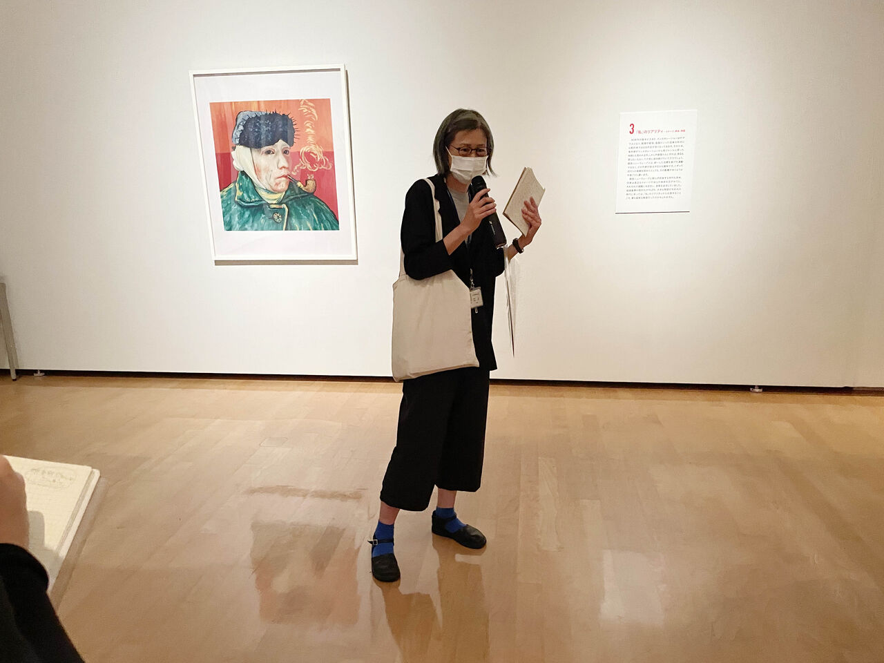 担当学芸員江上ゆか(記者説明会)、後方に森村泰昌『肖像(ファン・ゴッホ)』(1985年) 高松市美術館蔵