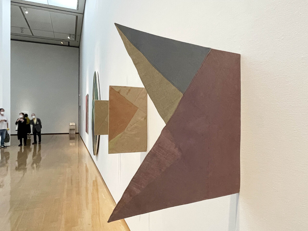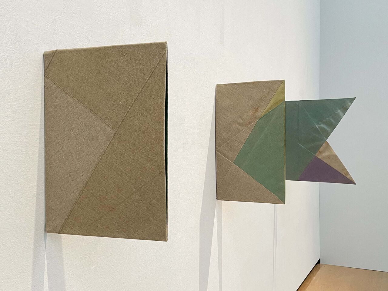 その中谷の作品を久しぶりに会場で拝見する。冊子の刊行から2年を経た連作『Passage』『Pass age』『Pas sage』(各1982年)。小ぶりになったが平面の磁場から逃れた麻布折りは、空間を志向するかのようだ。回文へのこだわりが彼にはあると思うが、小生、色彩の感覚が好きですな。現実の「夢」を借りた叙情性ある彼のテキスでは「絵は徹底して表面的な戯れであったとしても、それを対立、関係図式ではなく、その物理面を凌駕する深さ、奥行きに於いて捉えるものでなければならない」と綴られる。中谷の長所に「誠実さ」を捉える中島は「平面の問題等に関する知的な問い直しがある」としつつ「表面がどれほど強く平坦にプレスされていても、それがつねにひとつの均質な面となることを拒絶している」(中島徳博「一枚の布」1980年)と、その後の展開を予言。会場の連作はそうした格闘から生まれたのだと思う。