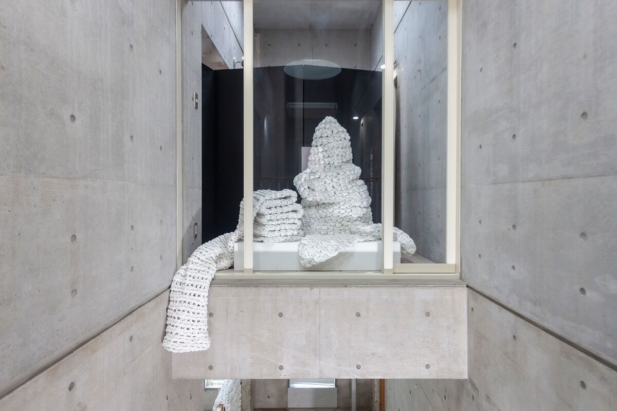 中村潤は編み、縫う作家である。小さな頃からものを作るのが好きだった中村は、手を加えることによって素材が変化する様に惹かれて彫刻を志したという。木や石など彫刻に多く用いられる素材も扱ってきたが、現在は、紙、糸、トイレットペーパーなどの生活の中にある柔らかい素材を使って制作している。