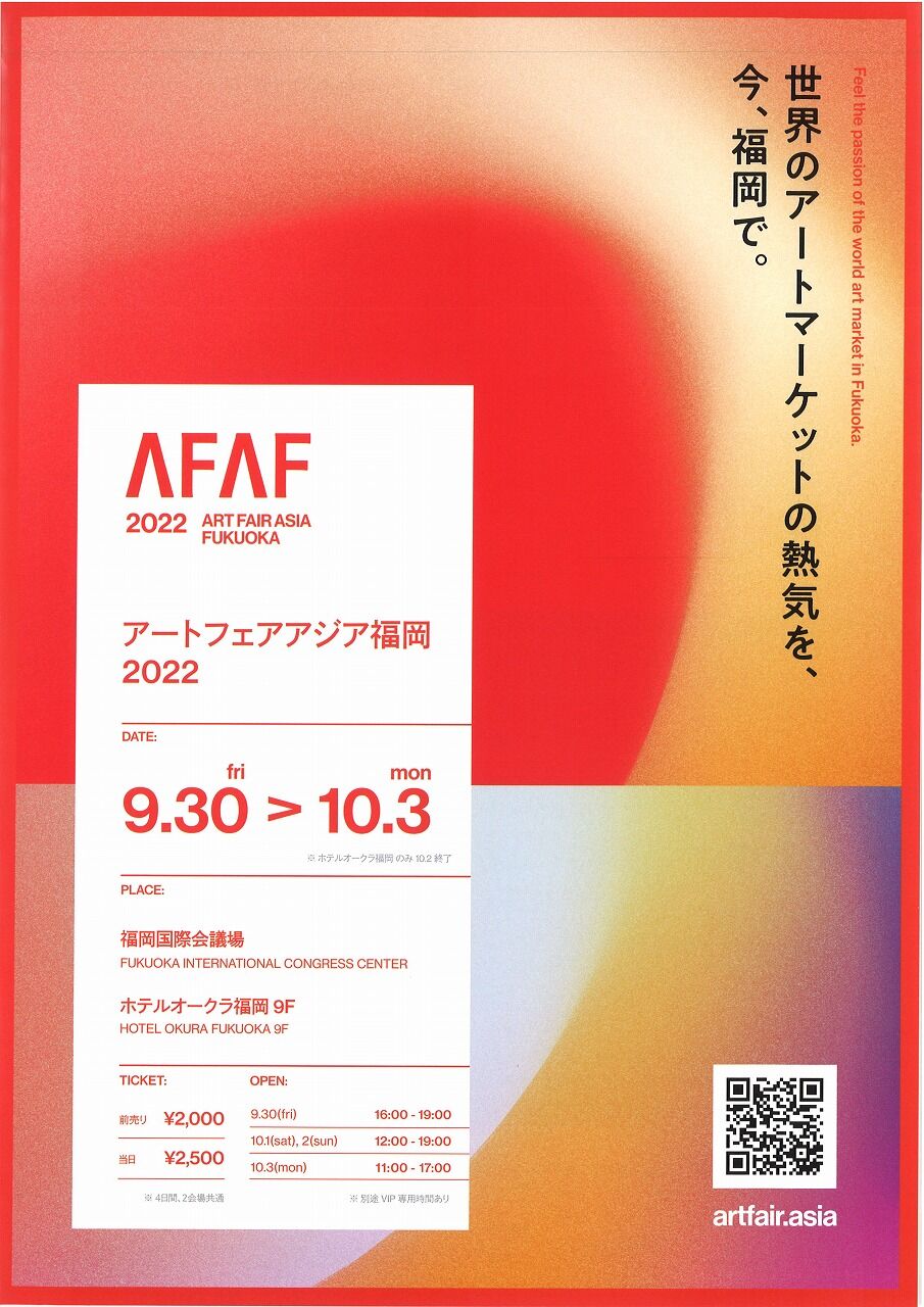 また、会期中は「アートウィーク」の実施が予定されるなど、福岡市内がアートに染まります。アジアのリーダー都市を目指す福岡市とともに、日本とアジアのアートマーケットの架け橋となるアートフェアになるよう、努めてまいります。新たな時代、新しい世界への第一歩を踏み出す「アートフェアアジア福岡 2022」へのご参加を心よりお待ちしております。(一般社団法人 アートフェアアジア福岡)