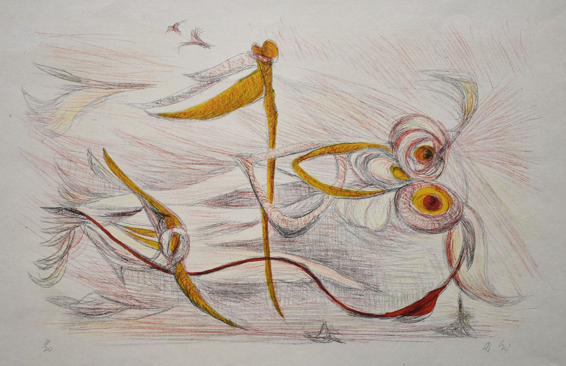 *林グラフィックプレス版「瑛九・銅版画」カタログではNo.214「愛の鳥」1956年、E.A.5と記載