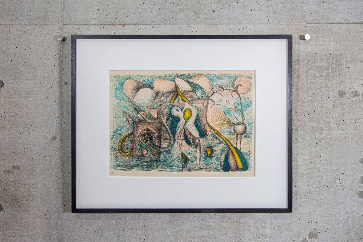 1951年から1958年までの足掛け8年の間に銅版画を約350点を制作しました(正確には330~350点)。銅版画の詩人と謡われた駒井哲郎が40数年かけて制作したのが約600点、それに比べても異例の集中制作だということがわかります。さらに1956年からはリトグラフにも本格的に取り組み(1951年に数点の試作)、1956年から1958年僅か3数年間に約160点を制作しました。銅版もリトグラフもプレス機を自宅に備え、ほとんどを自刷りしました。第31回瑛九展では「海辺の孤独」(リトグラフ)はじめ銅版画とリトグラフの代表作を中心に、晩年の油彩点描画もご覧いただきます。