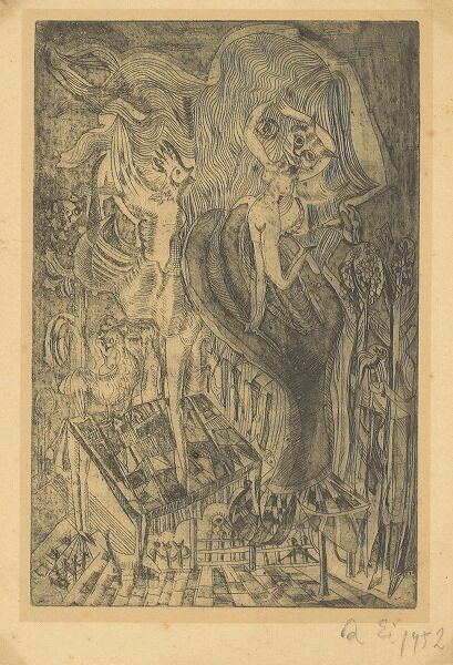 *林グラフィックプレス版「瑛九・銅版画」カタログではNo.171「鳥の精」1952、E.A.8と記載あり