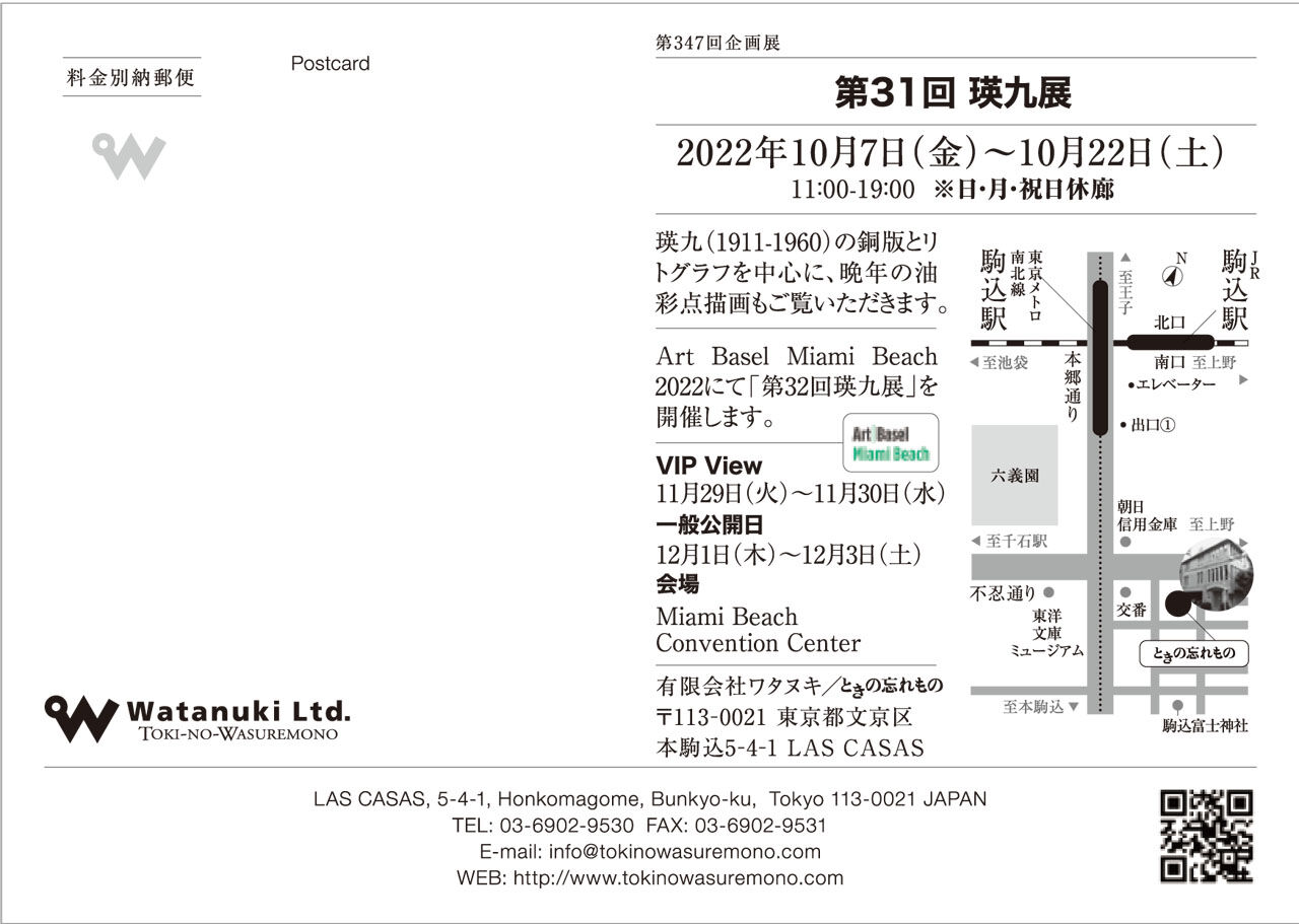 ときの忘れものでは、昨年9月の「第30回瑛九展 フォトデッサンと型紙」に続き、今秋は10月に駒込の画廊で第31回、翌11月には「Art Basel Miami Beach 2022」で第32回瑛九展を開催します。