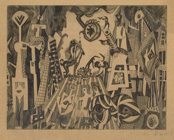 *林グラフィックプレス版「瑛九・銅版画」カタログではNo.34「街角」1953年、E.A.7と記載。