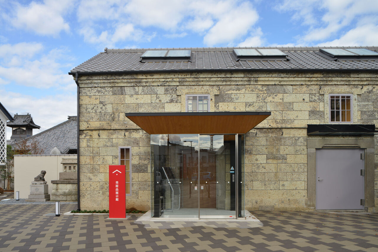 モニュメントの暖炉よりも奥に位置する大谷石造りの「美術品展示館」は、1923(大正12)年に米蔵として建てられ、1957(昭和32)年にはアトリエに改修され、かつては「久保アトリエ」と呼ばれました。この建物にも、久保の絵画コレクションの一部が飾られ、大胆にもその外壁に、瑛九、オノサト・トシノブ、靉嘔、池田満寿夫、泉茂から贈られた絵画が飾られていました。久保アトリエは、久保が主宰した真岡近代絵画鑑賞頒布会が行われるなど、芸術家たちが集うサロンのような場所だったようです。