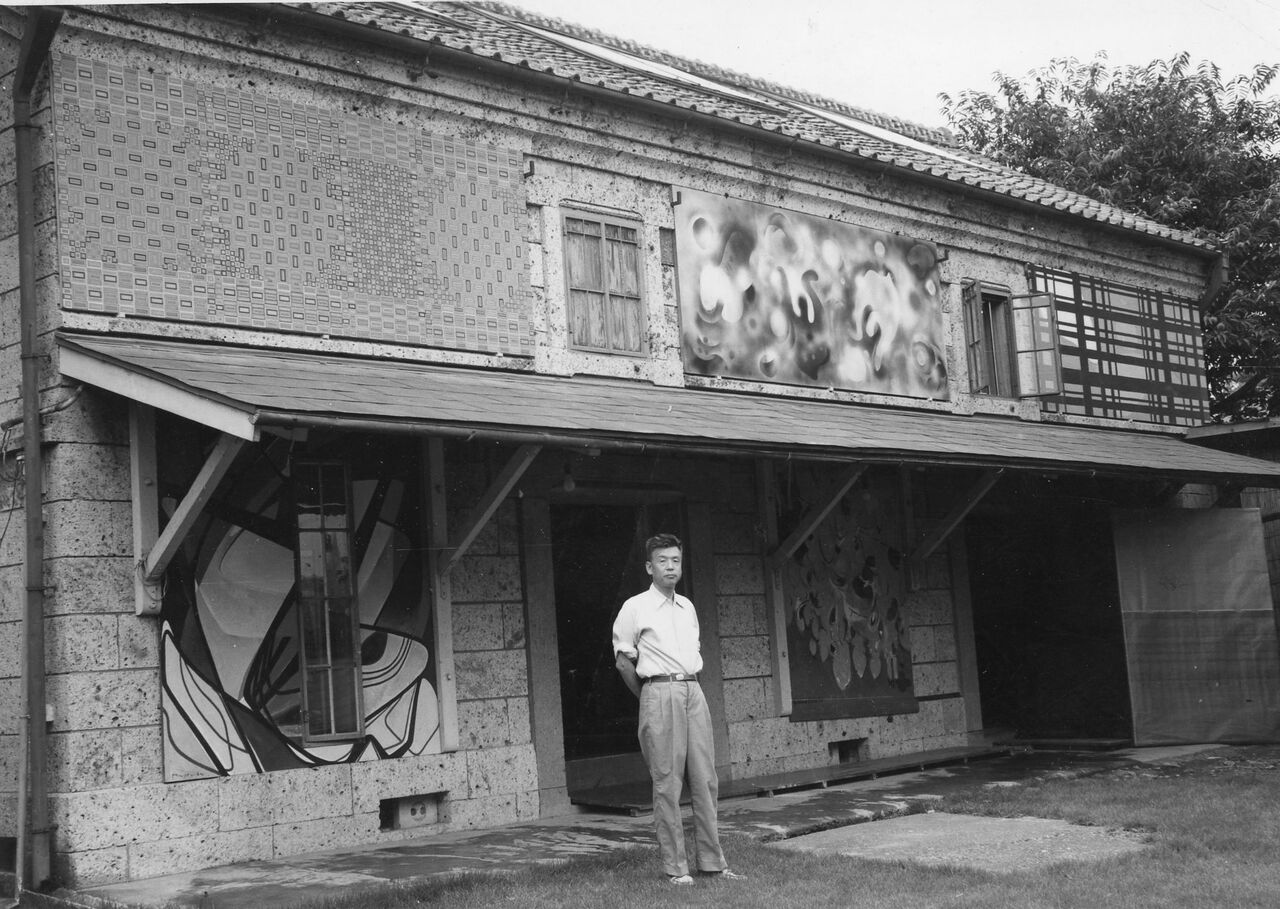 ⑥久保貞次郎と久保アトリエ外壁の様子 上左:オノサト・トシノブ《壁画A・B・C・D》、上中央:瑛九《カオス》、上右:靉嘔《四つの雲》、下左:池田満寿夫《運行》、下右:磯辺行久《火が燃える》 上左と上中央は東京都現代美術館蔵、他は真岡市蔵