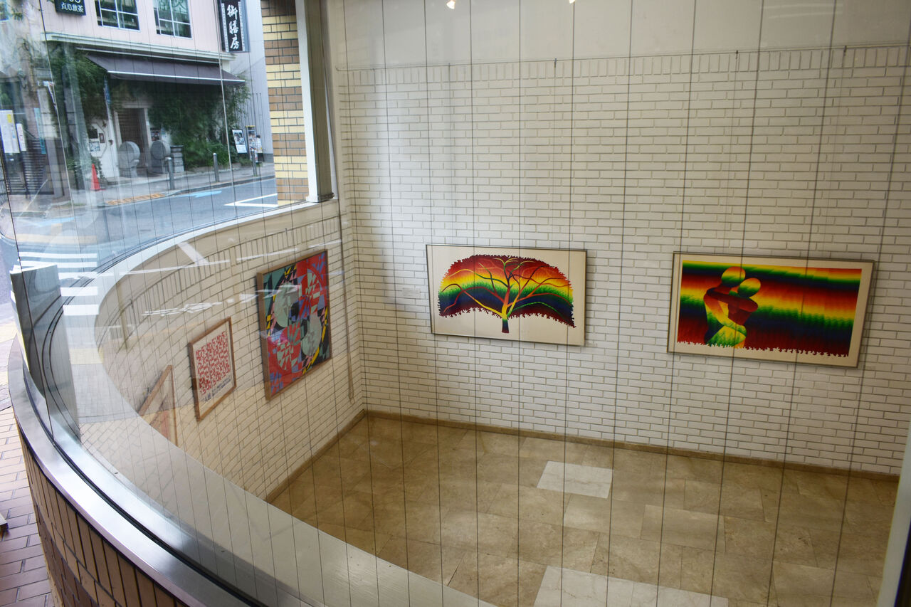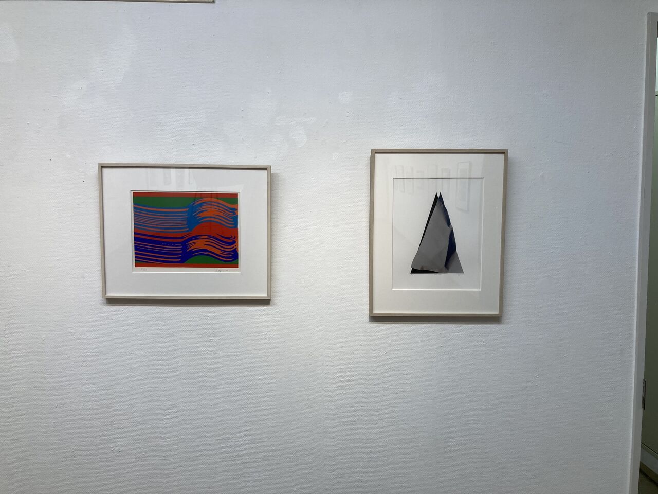 靉嘔「Rainbow landscape lithgraph A」の前で。秀坂令子さんは久保先生の秘書をつとめ、会場となったストライプハウスギャラリーの初期スタッフでもあります。エッセイ「久保貞次郎先生の思い出」は10月8日のブログに掲載しました。