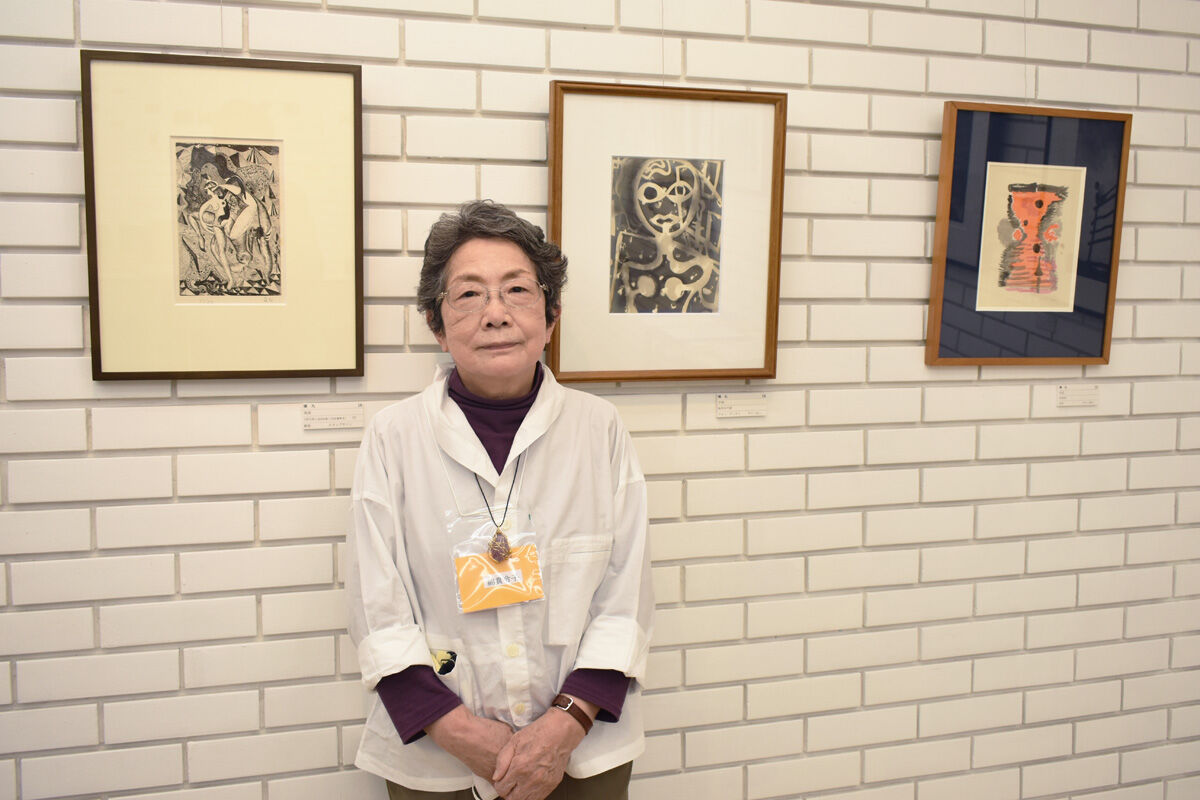 瑛九作品の前で。世話人の中では最年長は社長です。店番は世話人とボランティアの皆さんが交代でしますが、社長は月曜日(次回は24日)が担当です。久保先生の授業の様子は社長の同級生・北沢長子さんのインタビューをお読みください。