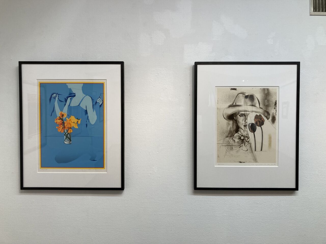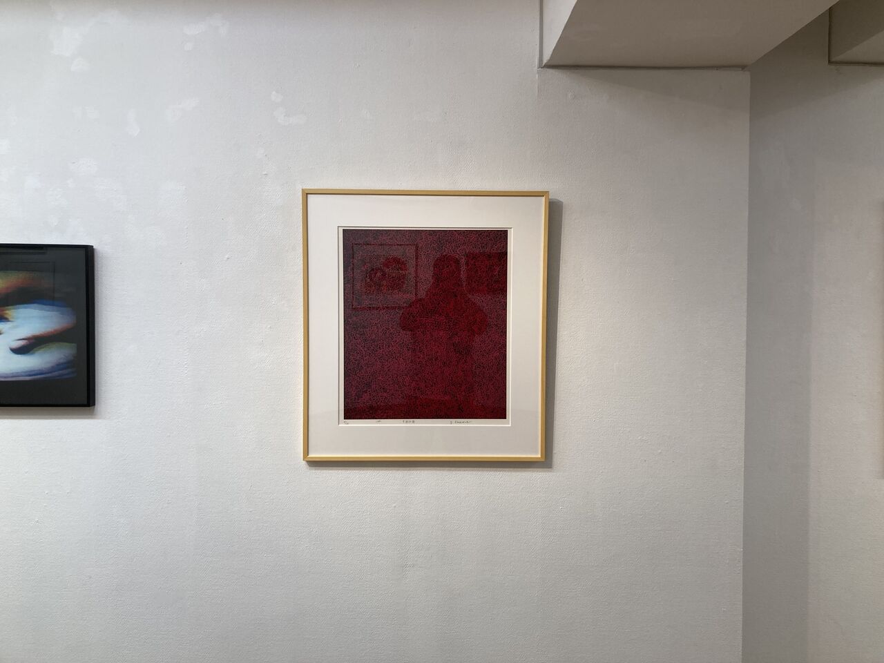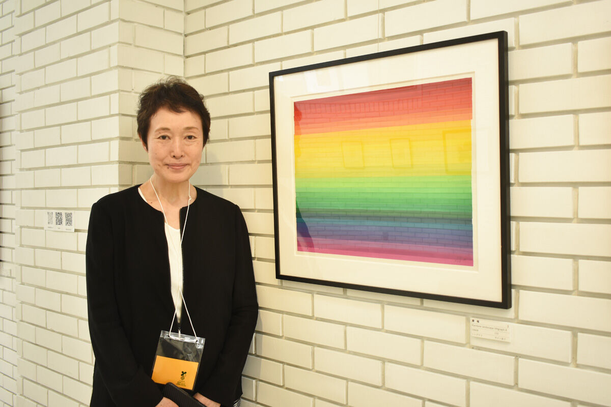 靉嘔「Rainbow landscape lithgraph A」の前で。秀坂令子さんは久保先生の秘書をつとめ、会場となったストライプハウスギャラリーの初期スタッフでもあります。