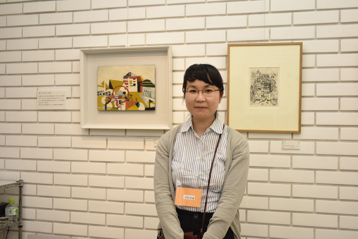 瑛九作品の前で。世話人の中では最年少の中村茉貴さんは、広報担当、ネットの発信で大活躍。ブログ連載「美術館に瑛九を観に行く」でもお馴染みですね。