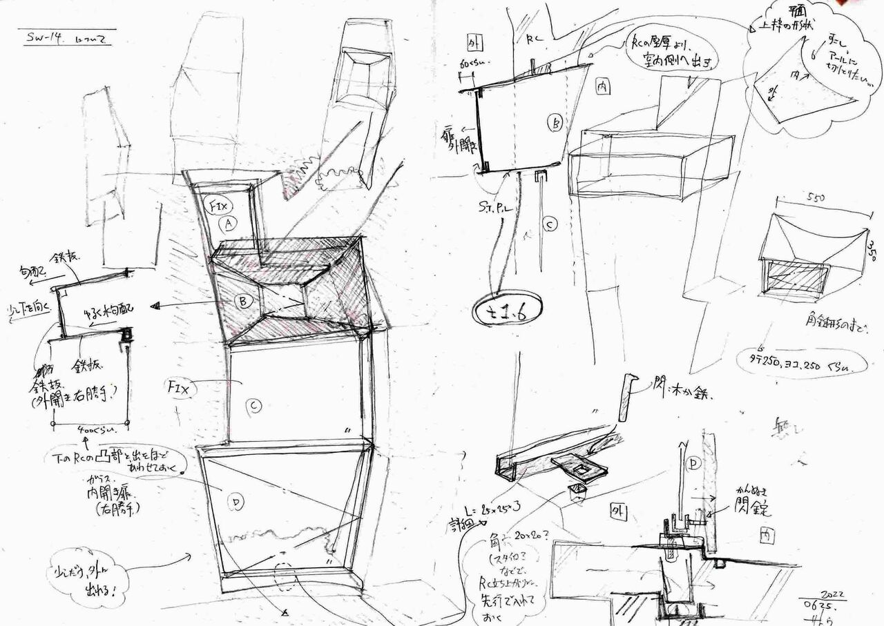 (数年前の制作案のスケッチ。鋭角鈍角を多彩に備えたコンクリートの開口に基本従う形で鉄の窓の形状を決め、その形状を起点にまた新たな立体を生み出し、付け足そうという案。)
