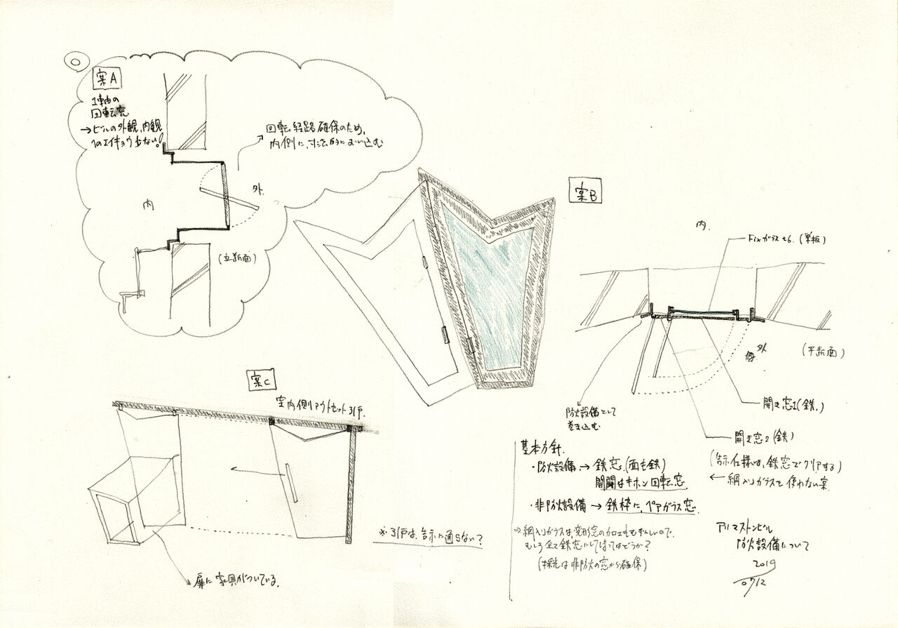 私はというと、もっぱらその現場では、工事元請や再開発事業側に工事の進捗を報告するいわゆる下請の監督業をやったり、それぞれ作業している人たちと次はどこの窓を作るかとか、どんな窓のアイデアがあるかの話をしたり、時々スッとアイデアのスケッチを差し出したり、をやっている。