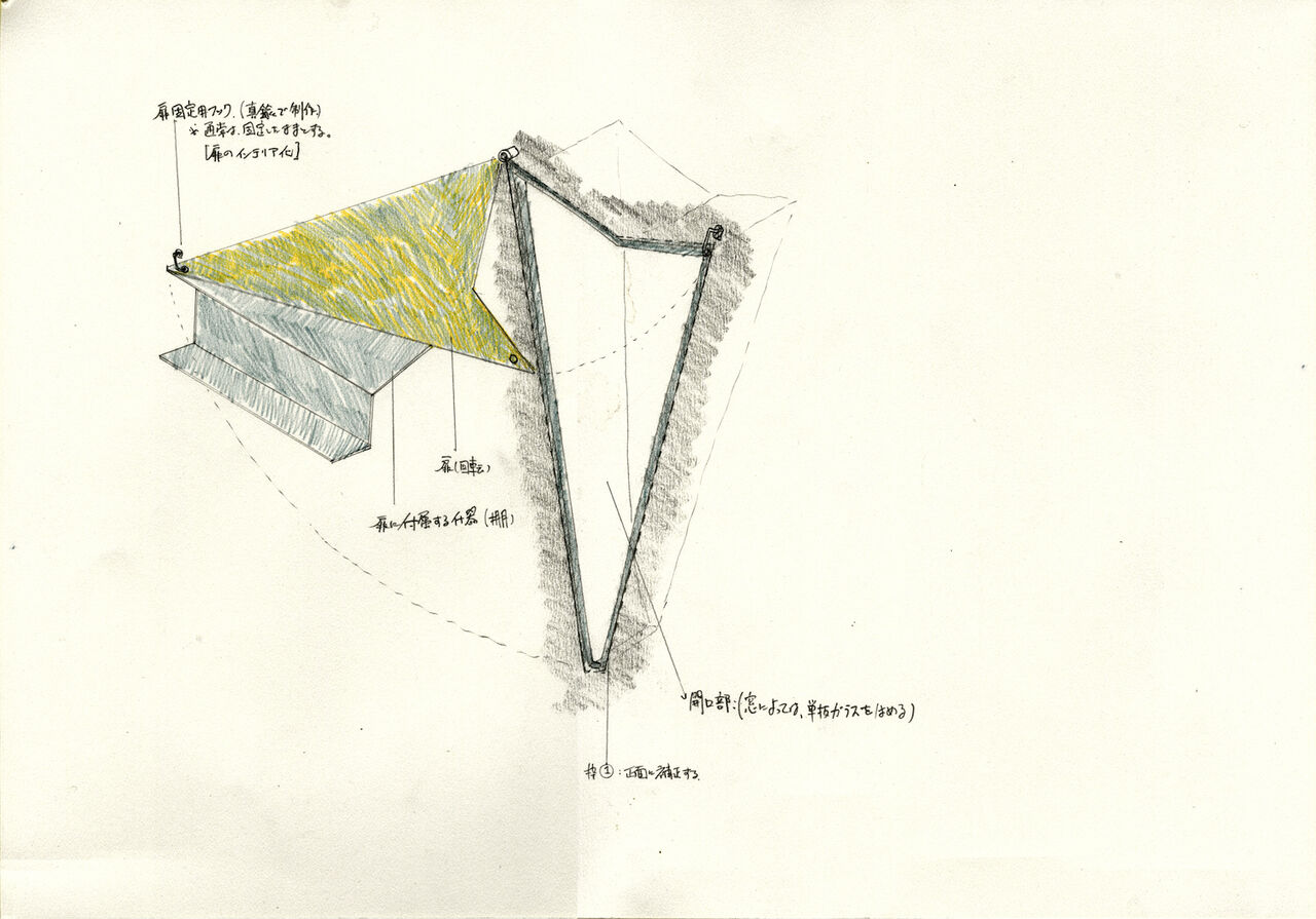 (数年前の窓制作案のスケッチ。この頃から、制作するモノに窓という一つの機能だけでなく、内側に飛び出てくる棚とかハコとかの別の機能を付帯させようとしている。)