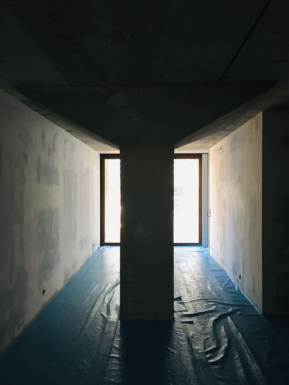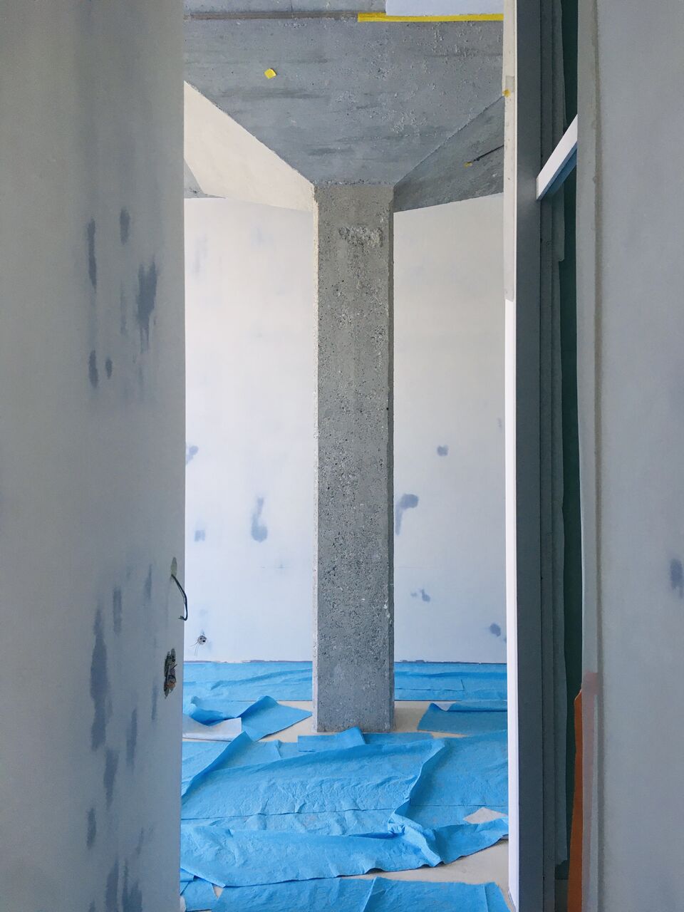 写真にある1K の住まいでは部屋のど真ん中に大きな柱があり、それが当然のように部屋を前後に二分しています。部屋の大きさに対してこんなに存在感のある柱は今まで見たことがありません。もしこの計画が新築だとしたら、どうしてこんなに大きな柱をここに計画したんだ?と大きな疑問が湧いてくるのですが、「与えられたモノ」であることによって、どういうわけか逆にワクワクした感じがしないでもないんです。