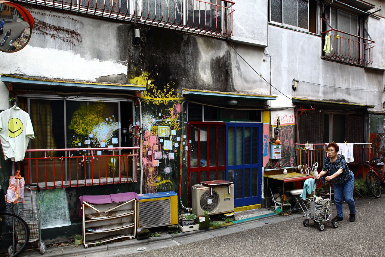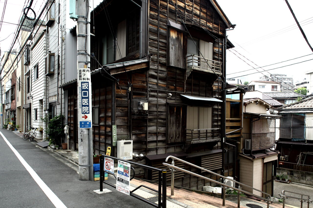 井戸の奥に石段の坂道がある。そこも急峻な崖地である。石段の両側に木造三階建ての古びた住宅が建っている(ph2)。左の住宅はICHIYO HOUSEの名で、Google地図にも載る。インターネットで検索すると、入居者募集の不動産広告があり、「築年数は約90年」、「大正時代に建築されたとか」を売り文句にしている。
