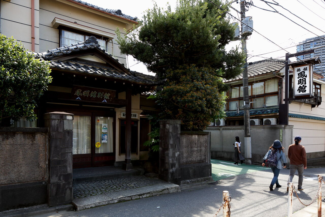 ph11 胸突坂。坂上の旅館鳳明館。本館(奥、本郷5-10)と別館(手前、本郷5-12)の間の通りは梨木坂。2022.05.03
