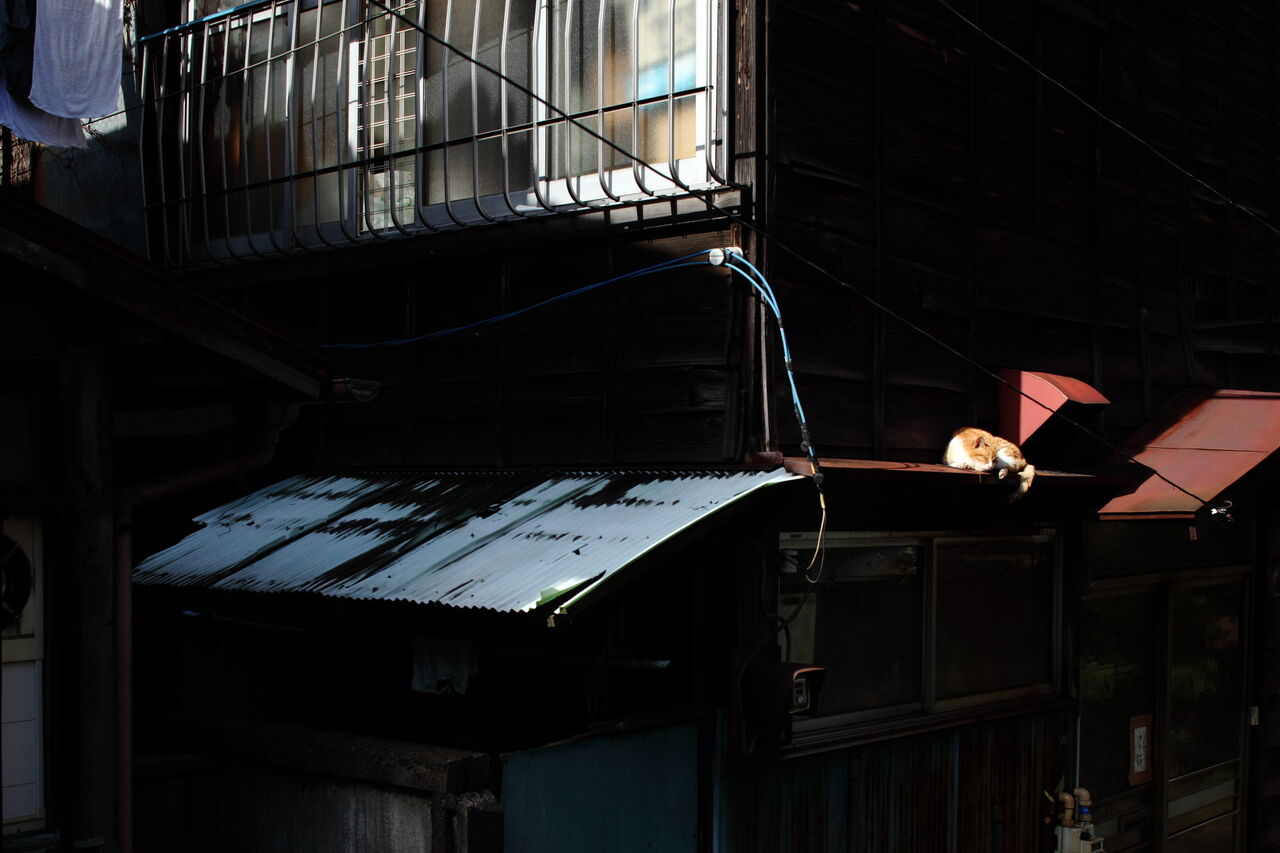 その1ヶ所に大正末か昭和初期の築と思しき木造建築がある。菊坂通りからはふつうの二階建てだが、階段の脇の脇に立つと紛れもなく三階建てである(ph9)。菊坂通りとその下の道との間は急峻な崖地になっていて、その崖地に住居や商店などが、肩を寄せ合うように軒を連ねているのである。