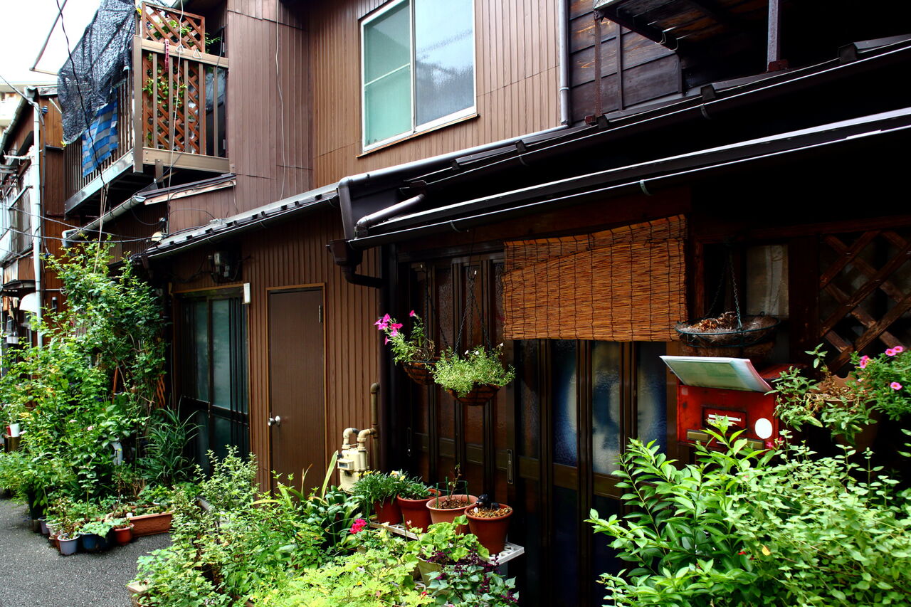 ph2 樋口一葉旧居のあたり。斜面に木造三階建て2棟が建つ。本郷4-32。2015.08.21