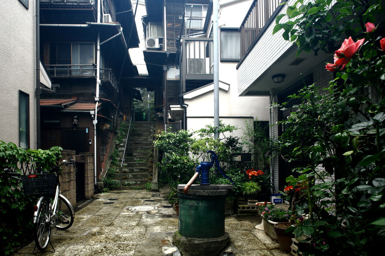 本郷の観光名所になっている樋口一葉の旧居跡は、この階段からほど遠くない住宅地の一画にある(ph1)(註7)。路地の一つを入っていくと、奥まったところに手押しポンプの井戸が残っている。共同井戸と思われるが、これに洗い場がついている。周りを石畳で舗装していることもあるが、周りの住居の狭苦しさと比べ、なんとなくゆったりした雰囲気がある。耳をすませば、女たちの井戸端会議が聞こえてくるような気もする。
