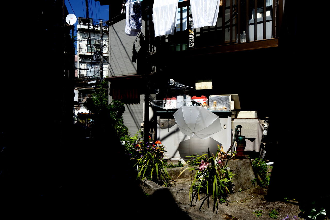 炭団坂を下りたところで道は二手に分岐する。まっすぐ30mほど歩くと道路に突き当たる。ここが大なだれの崖地で、突き当りの道路は本妙寺坂の溝川(大下水)の流路跡である(ph5)。私が惹かれるのは、こちらのまっすぐな道ではなく、脇道になっている狭い路地の方である。この一画の佇まいには、時の流れに取り残されたような静けさがある。途中に手押しポンプの井戸があるが、このときは、井戸端のシンピジウムやクンシュランが花を咲かせ、その傍にビニール傘が干してあった(ph4)。