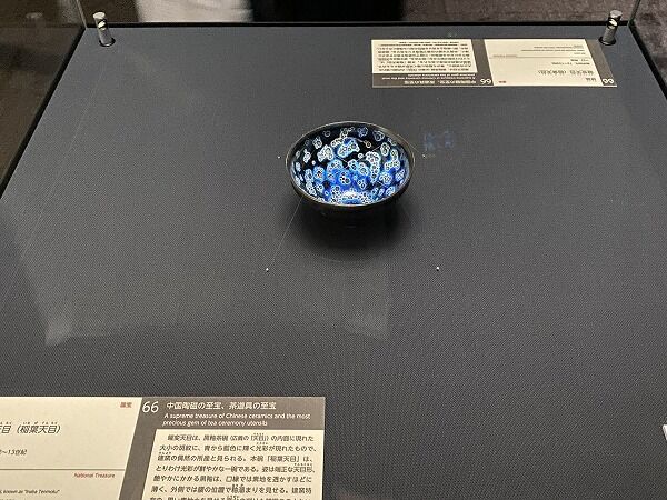 目を奪われる椀は、12~13世紀の中国陶磁の至宝、茶道具の至宝《曜変天目》。斑紋は建窯の偶然にできたものらしいが、何とも不思議な輝きの椀で、さらに美しく輝かせるために特別な照明付きの彫刻台を製作したそうです。