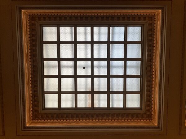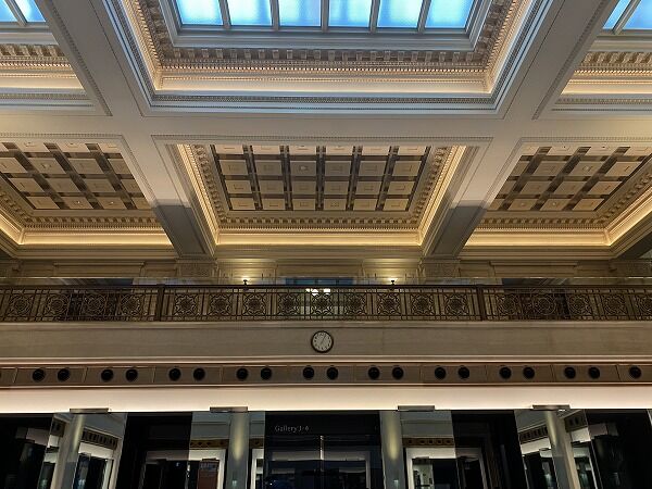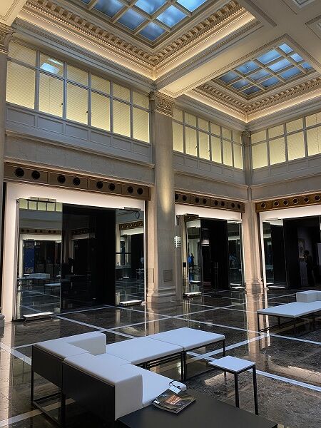 大理石の柱は梁型の装飾、ブロンズ製のバルコニーの手摺など、往時の姿を保存し活用している2層吹き抜けの空間ホワイエ。
