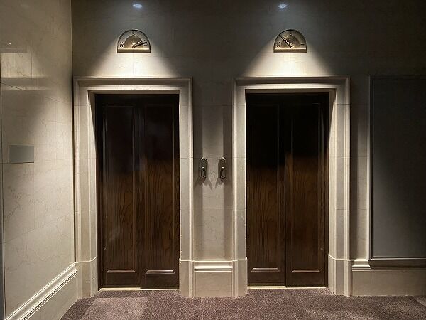 展示室の中に、昔使用されていたエレベーターがありました。現代のエレベーターに比べると、扉が随分と小さく感じます。時計針式のフロアインジケーターがレトロでいい感じです。