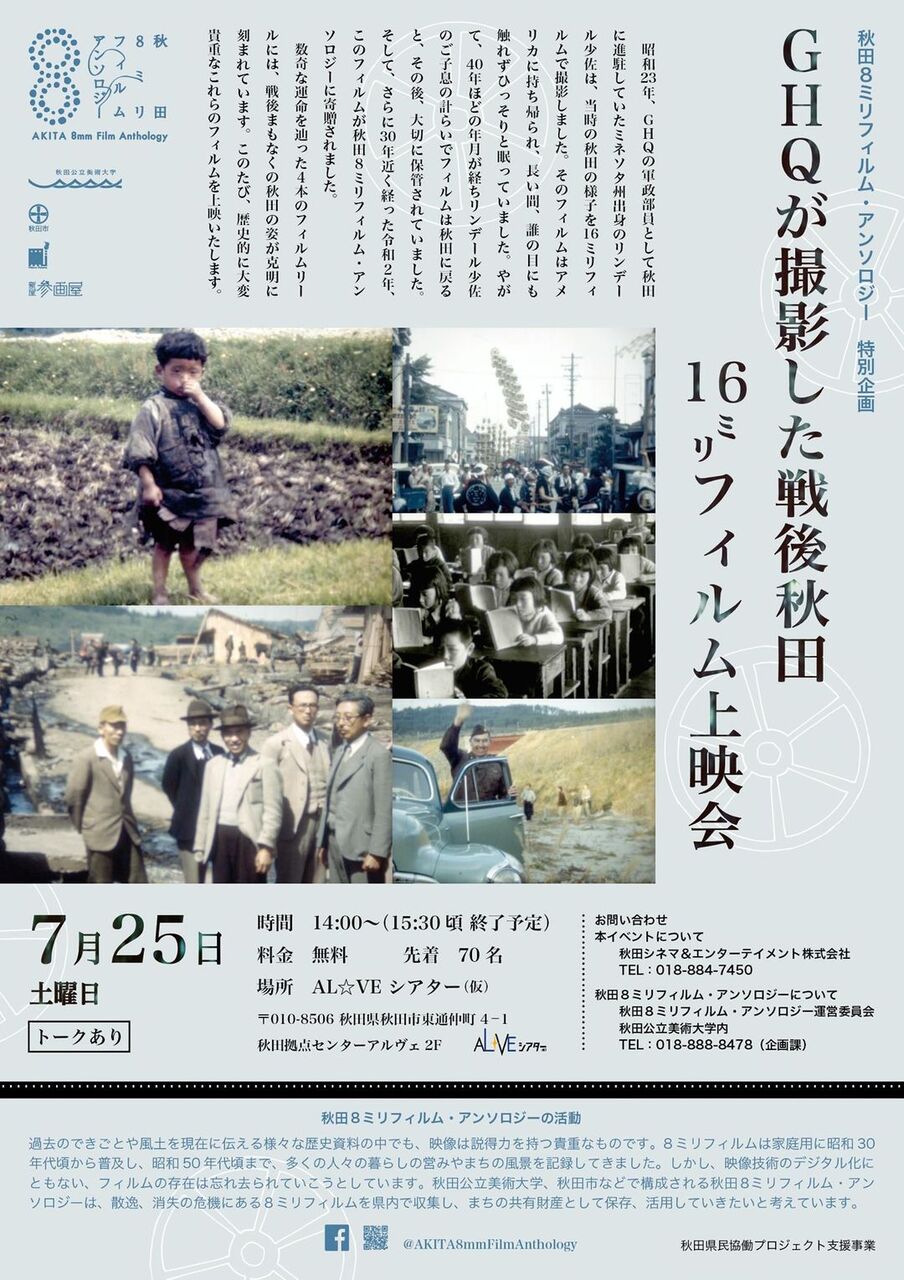先日、秋田8ミリフィルム・アンソロジーのもとに終戦直後の昭和23年に当時の秋田に進駐していたGHQの将校によって撮影された16ミリフィルムが寄贈されました。大変状態も良く、当時の秋田の様子が鮮明に捉えられている映像です。